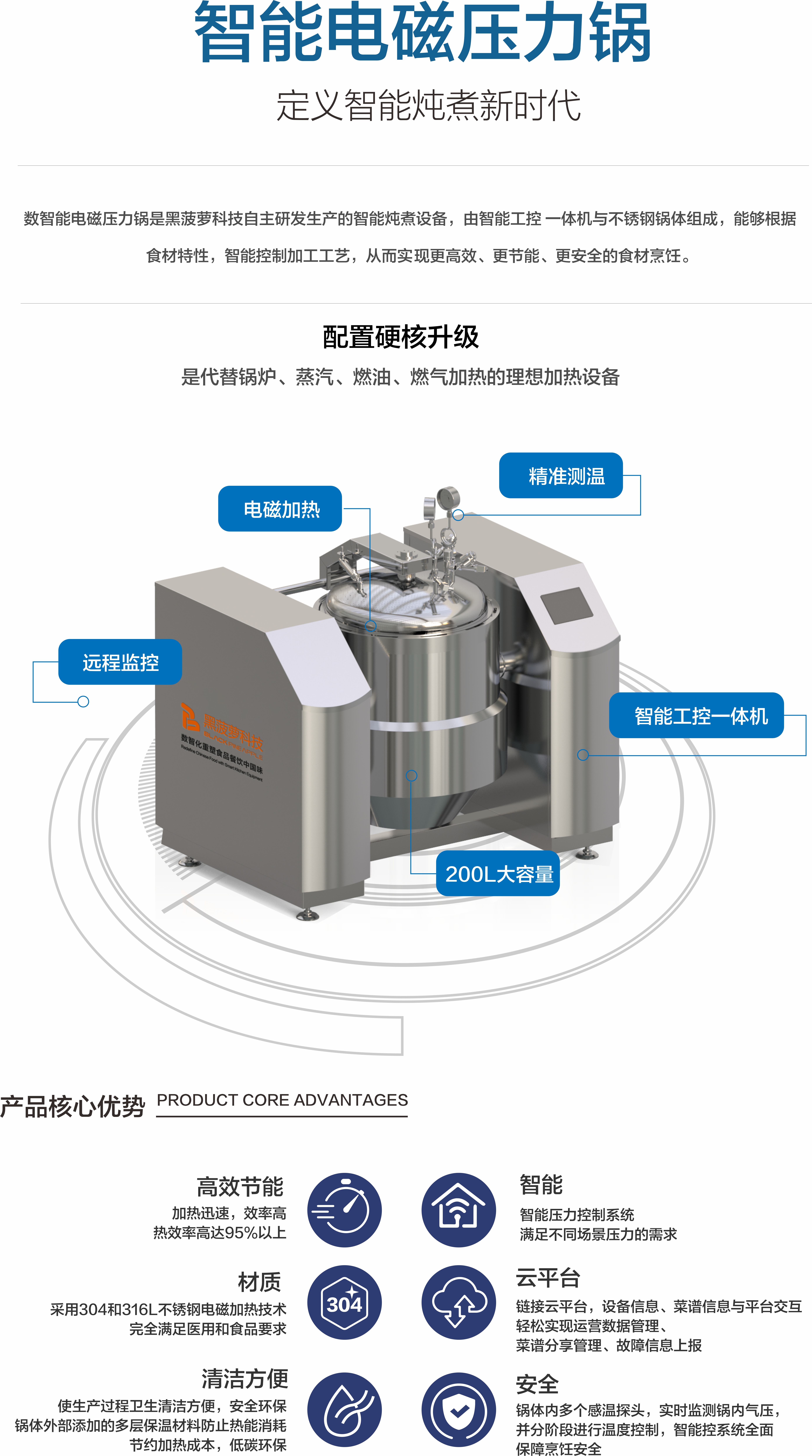 智能電磁壓力鍋采用最新的304不銹鋼電磁加熱技術,集智能控溫、智能控壓、智能云配方、智能配料等功能于一體。適用于大型中央廚房、機關及企業(yè)食堂燉蒸煮、燉湯、熬粥、燒菜等多種加工需求。